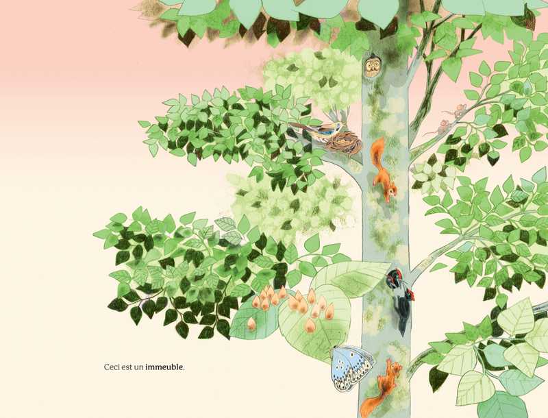 Ceci n’est pas encore un arbre. Ceci est un immeuble. Ceci est un restaurant. Ceci est une école. Ceci est un abri… Ceci n’est pas seulement un arbre. Le mot « arbre » en cache bien d’autres, et on découvre ceux qui le peuplent, ce qu’il permet, ce qu’il fait naître.