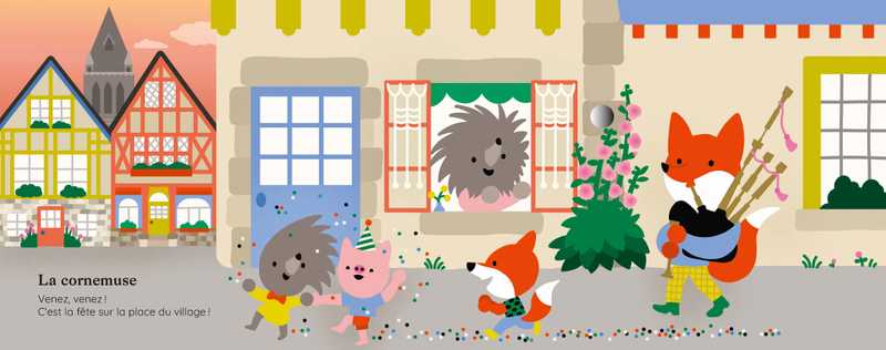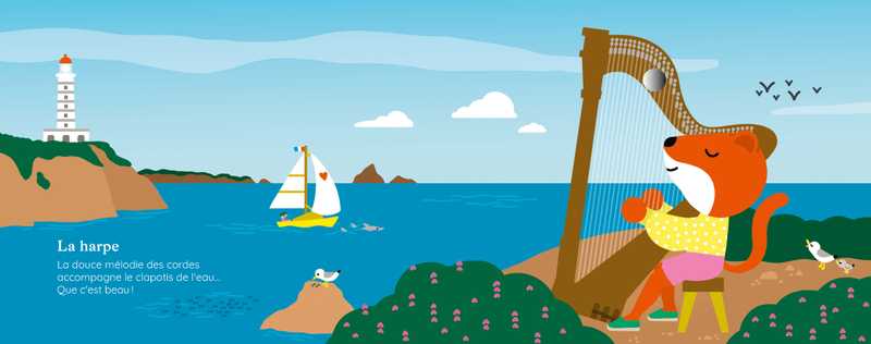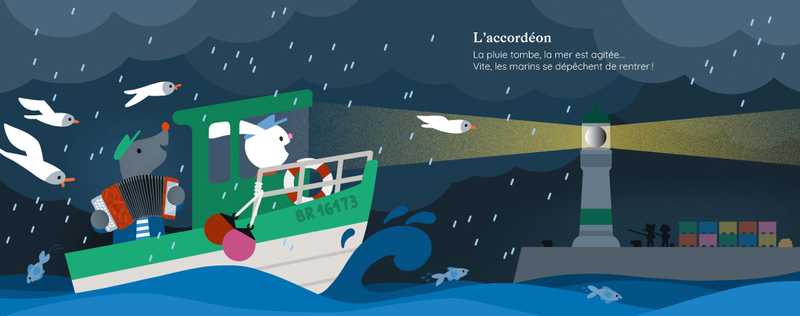 Une balade colorée qui sent bon les embruns ! Marion Cocklico associe chaque instrument à un animal et à un paysage qui évoque joliment la Bretagne : écureuils, renards, belettes et taupes jouent de leurs instruments sur des falaises ensoleillées du bord de mer, devant des maisons fleuries à colombages, à l’entrée d’un port sous la tempête, ou en compagnie de petits cochons en pleine partie de pêche à pied !