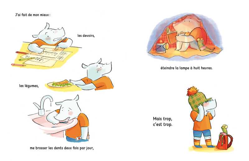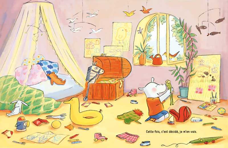 « Cette fois, c’est décidé, je m’en vais. J’ai fait de mon mieux : les devoirs, les légumes, me brosser les dents deux fois par jour, éteindre la lampe à huit heures. Mais trop, c’est trop. […] Adieu, Papa. Adieu, Maman. N’insistez pas : l’aventure m’appelle. »