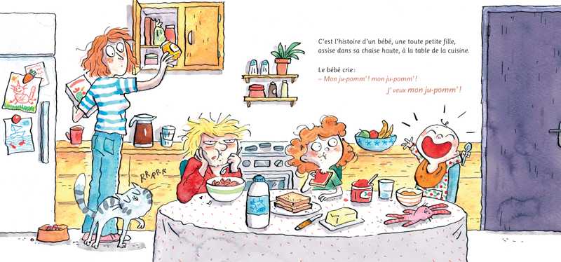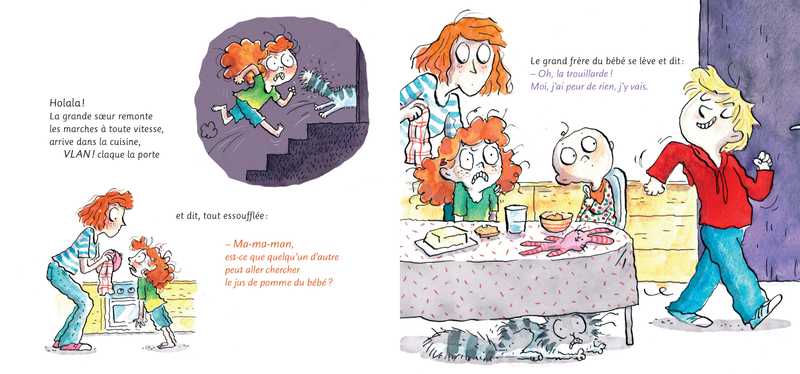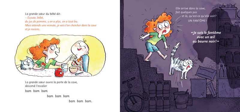 C’est l’histoire d’un bébé. Le bébé crie : « Mon ju-pomm ! Mon ju-pomm’ ! J’veux mon ju-pomm’ ! ». Sa grande sœur descend en chercher à la cave, Bam-bam-bam bam-bam-bam bam-bam-bam-bam. Elle arrive dans la cave, fait quelques pas et là, qu’est-ce qu’elle voit ?... UN FANTÔME ! « Je suis le fantôme avec un œil au beurre noir ! » Effrayée, la grande sœur remonte les marches quatre à quatre, claque la porte et demande tout essoufflée si quelqu’un d’autre peut y aller. À qui le tour ?