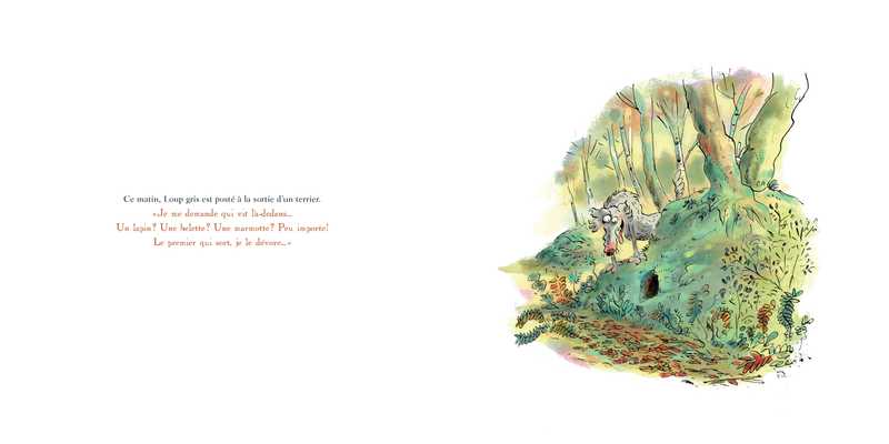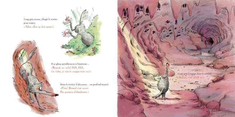 Ce matin, Loup gris est posté à la sortie d’un terrier avec l’ambition de dévorer le premier sorti. Renard pointe le bout de museau : « Hey Loup gris, t’es toujours aussi malin ! T’as pensé à devenir végétarien ? Mange des carottes, tu feras un super lapin ! » Loup gris voit rouge : il se précipite pour régler son sort à Renard. Sous la terre, pas de trace du goupil mais Loup gris découvre un profond tunnel, puis un dédale de chemins…