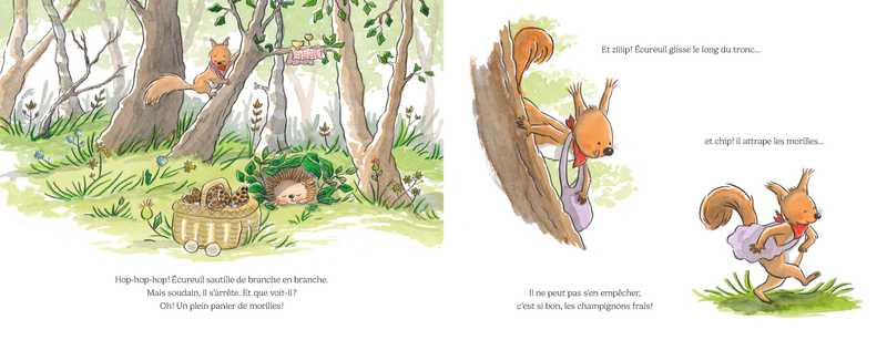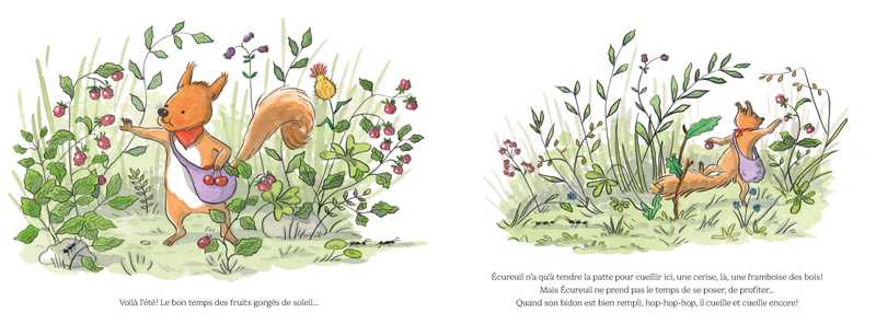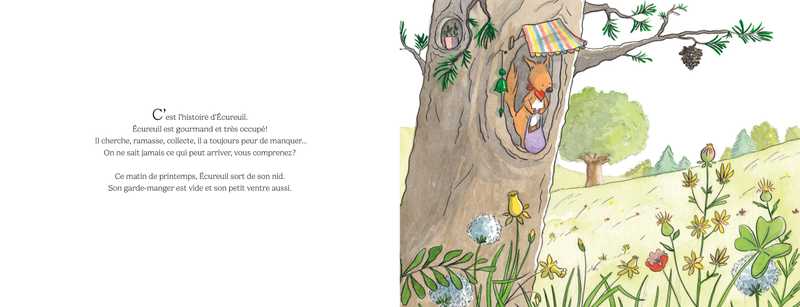 Dans la vie, Écureuil est gourmand et très affairé, parce qu’il a toujours peur de manquer. Il ne peut pas s’arrêter d’amasser, des châtaignes, des glands, des noisettes, des pommes de pin… Il va même jusqu’à chiper chez les copains. « On ne sait jamais, vous comprenez ? » Son garde-manger est plein, plein à craquer ! Alors quand un jour, il pousse, pousse pour faire de la place à une châtaigne bien grillée, BRAOUM ! tout s’écroule et ses réserves s’échappent par la fenêtre. Comme son nid semble grand, maintenant ! Et voilà qu’il retrouve ses chaussons adorés, et même un cadeau que Lapin lui avait fait et qu’il avait égaré dans son nid trop rempli ! Comme c’est doux, comme c’est bon… Et s’il invitait ses amis à partager ce qu’il a amassé autour d’un grand goûter ? Il a bien trop de choses à manger pour lui tout seul ! « Une châtaigne a suffi ! Écureuil a enfin compris que trop avoir dans ses armoires ne rend pas la vie plus jolie ! »
